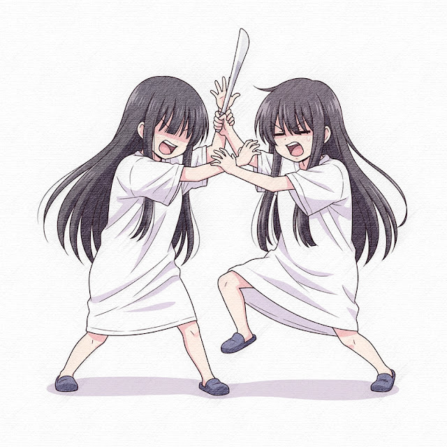 想像するとすごくカオスで、どこか笑ってしまうような光景ですね。以下、ホラー界の東西代表、**山村貞子(日本)とサマラ・モーガン(アメリカ)**が取っ組み合いを始める様子を、ホラーの雰囲気を残しつつも、ややユーモラスに描写してみます。